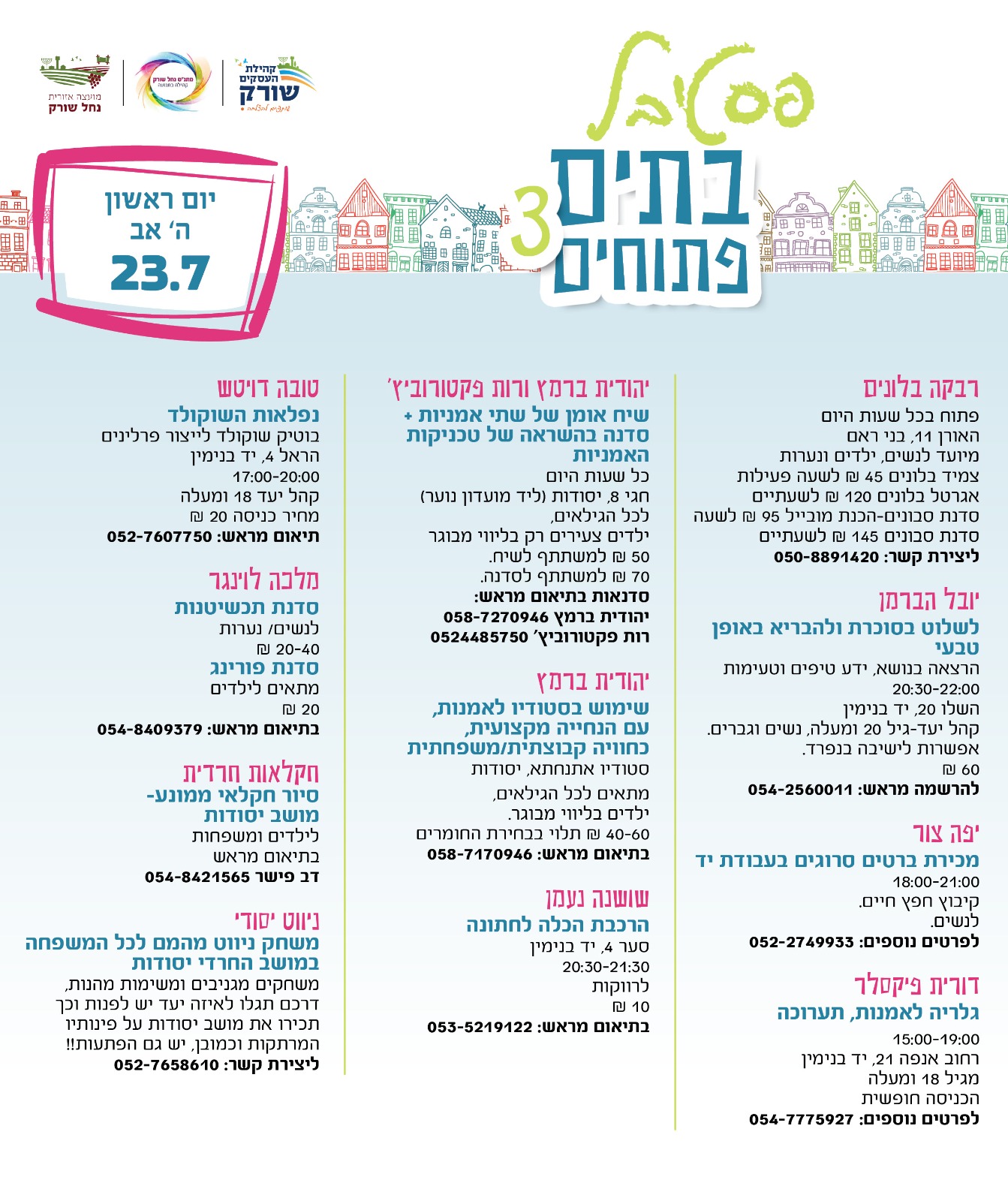 פסטיבל בתים פתוחים, מטרתו להפגיש את הציבור עם האומנים, החקלאים ובעלי העסקים הקטנים במועצה. השנה, בעקבות השסע הגדל במדינה בין המגזרים השונים, החלטנו לתת דגש מיוחד להיכרות עם חברי הקהילה החרדים ולאפשר מפגשים וסדנאות מהנים ומרתקים שישברו סטיגמות ויאפשרו הצצה חווייתית והיכרות אחרת עם המגזר.