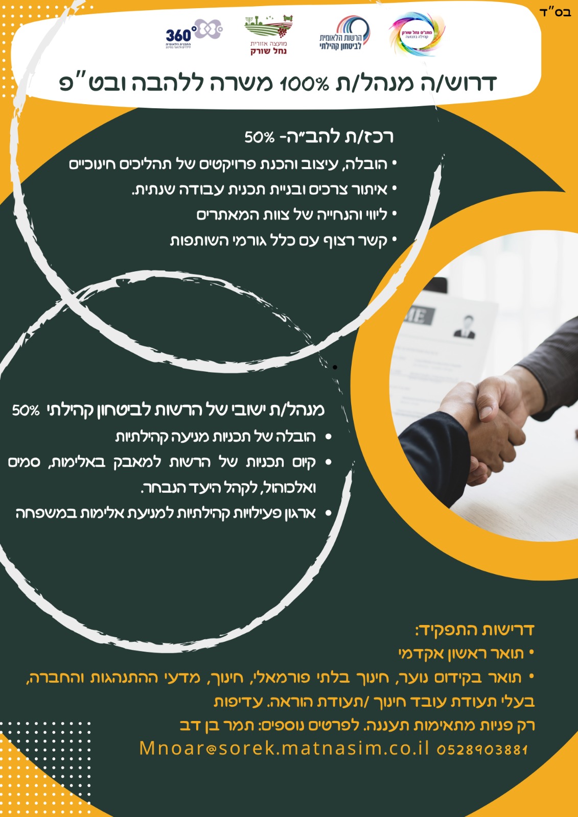 דרוש/ה רכז/ת להבה ומנהל/ת של הרשות לביטחון קהילתי ל100% משרה