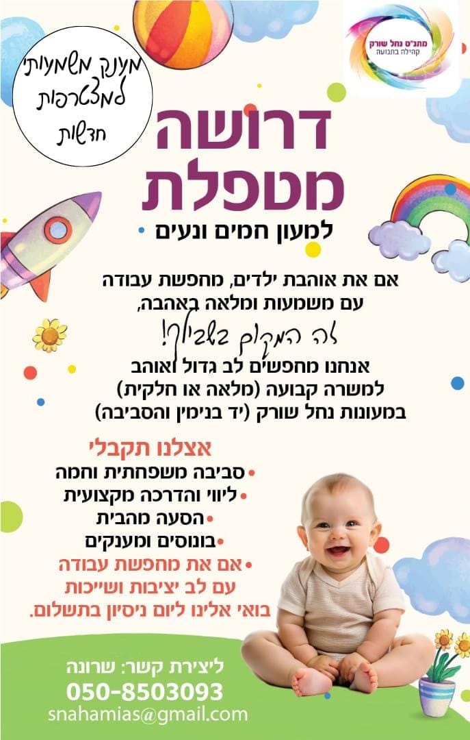 דרוש/ה מטפל/ת למעונות היום בנחל שורק