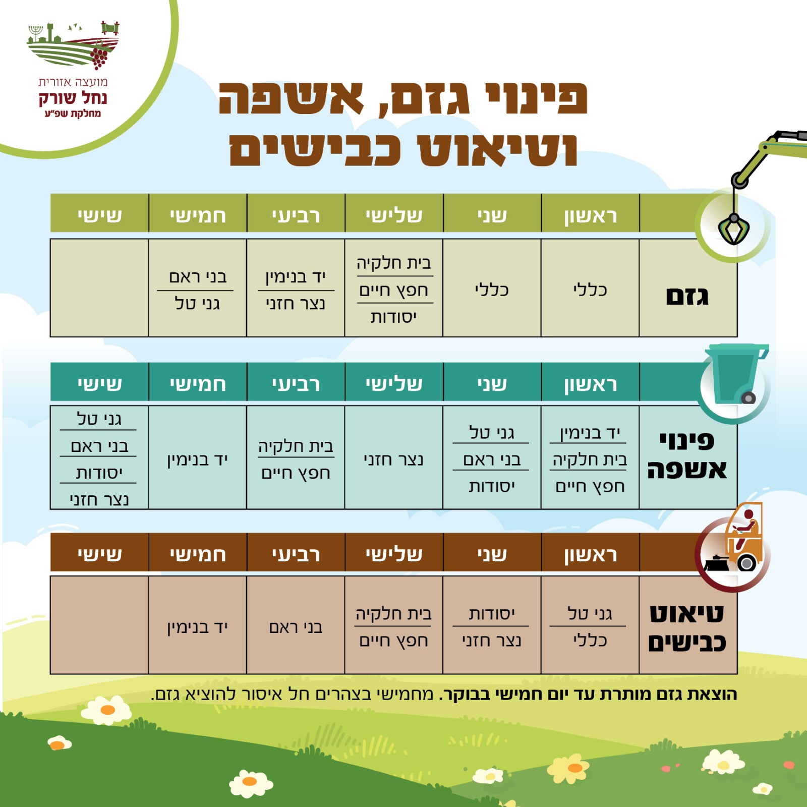 שאר היישובים בימי חמישי בבוקר. ניתן להוציא גזם וגרוטאות מיום רביעי בצהרים ועד יום חמישי בשעה 6:00 בבוקר.