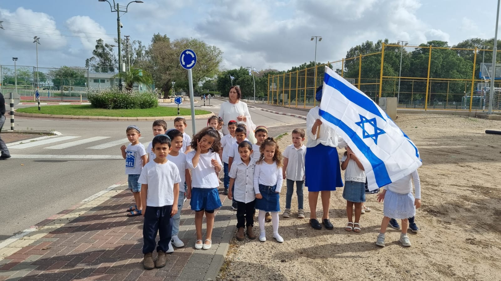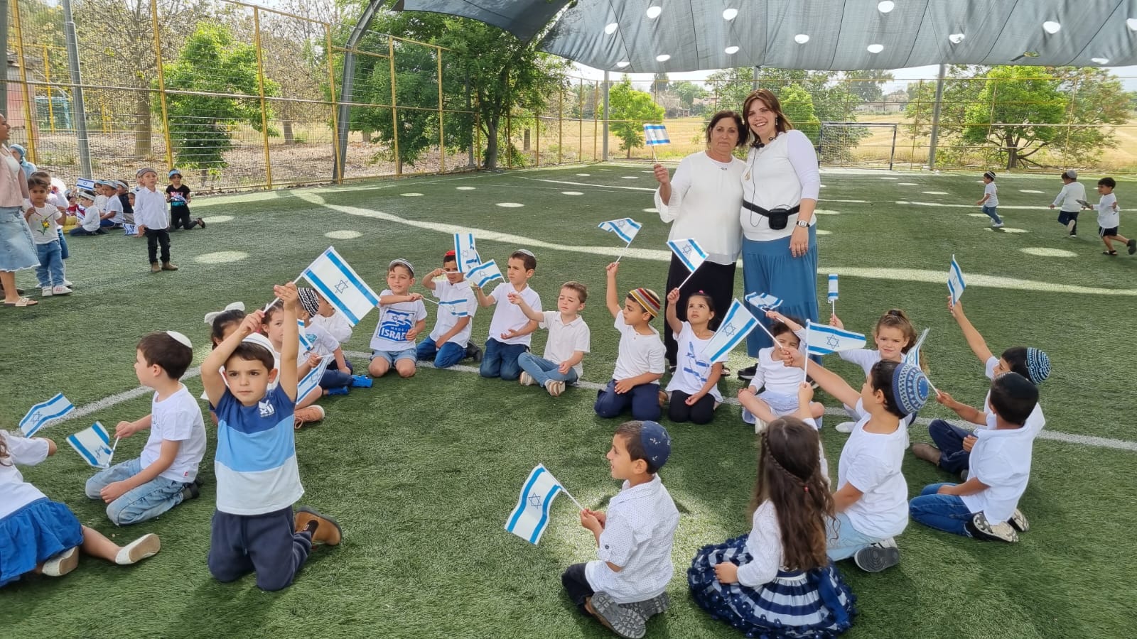 המגרש התמלא בילדים שמחים לבושים כחול לבן, דגלים ומוזיקה. רותי הריתמיקאית הפעילה את הילדים שנהנו לציין את 75 השנים.