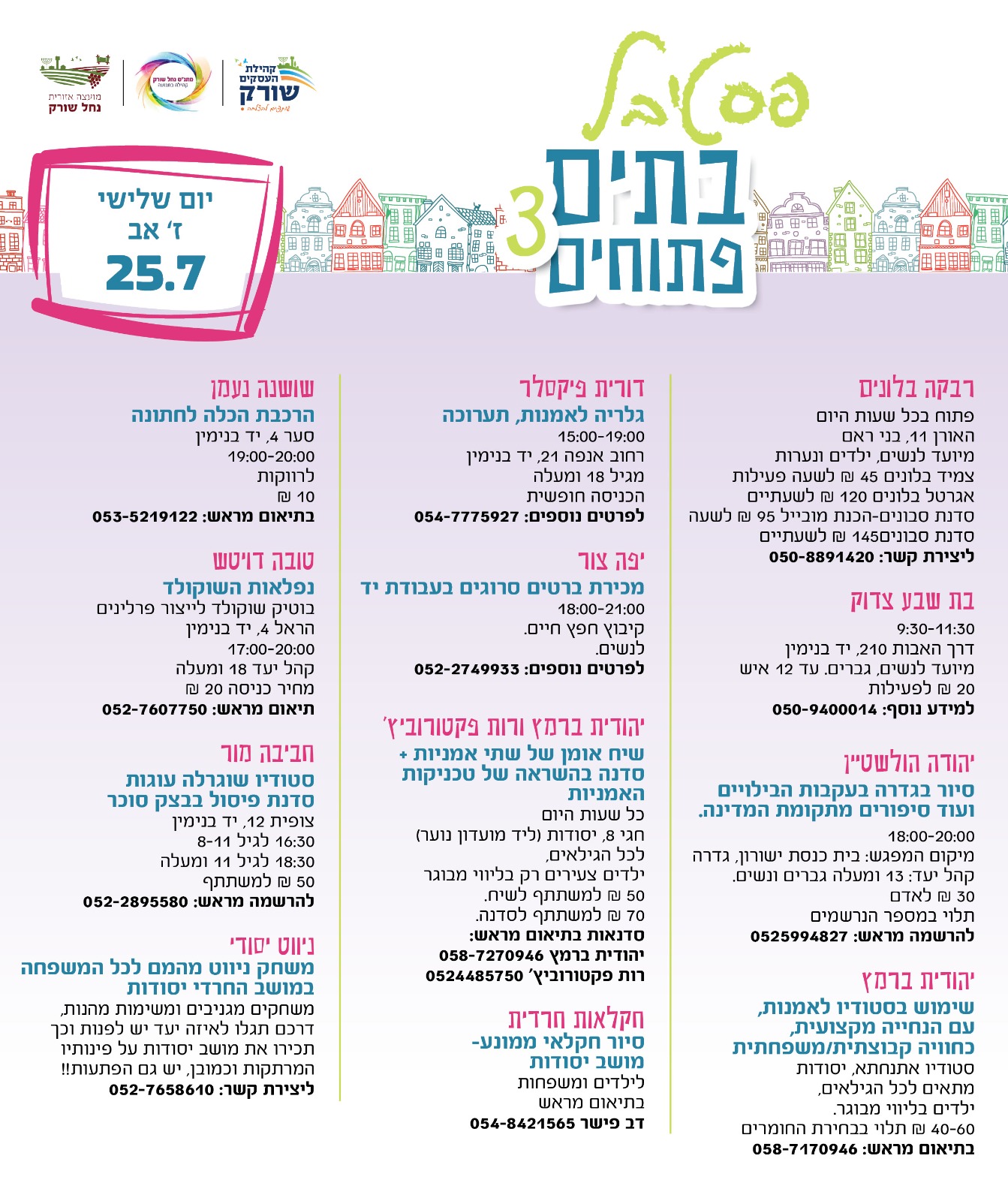 פסטיבל בתים פתוחים, מטרתו להפגיש את הציבור עם האומנים, החקלאים ובעלי העסקים הקטנים במועצה. השנה, בעקבות השסע הגדל במדינה בין המגזרים השונים, החלטנו לתת דגש מיוחד להיכרות עם חברי הקהילה החרדים ולאפשר מפגשים וסדנאות מהנים ומרתקים שישברו סטיגמות ויאפשרו הצצה חווייתית והיכרות אחרת עם המגזר.